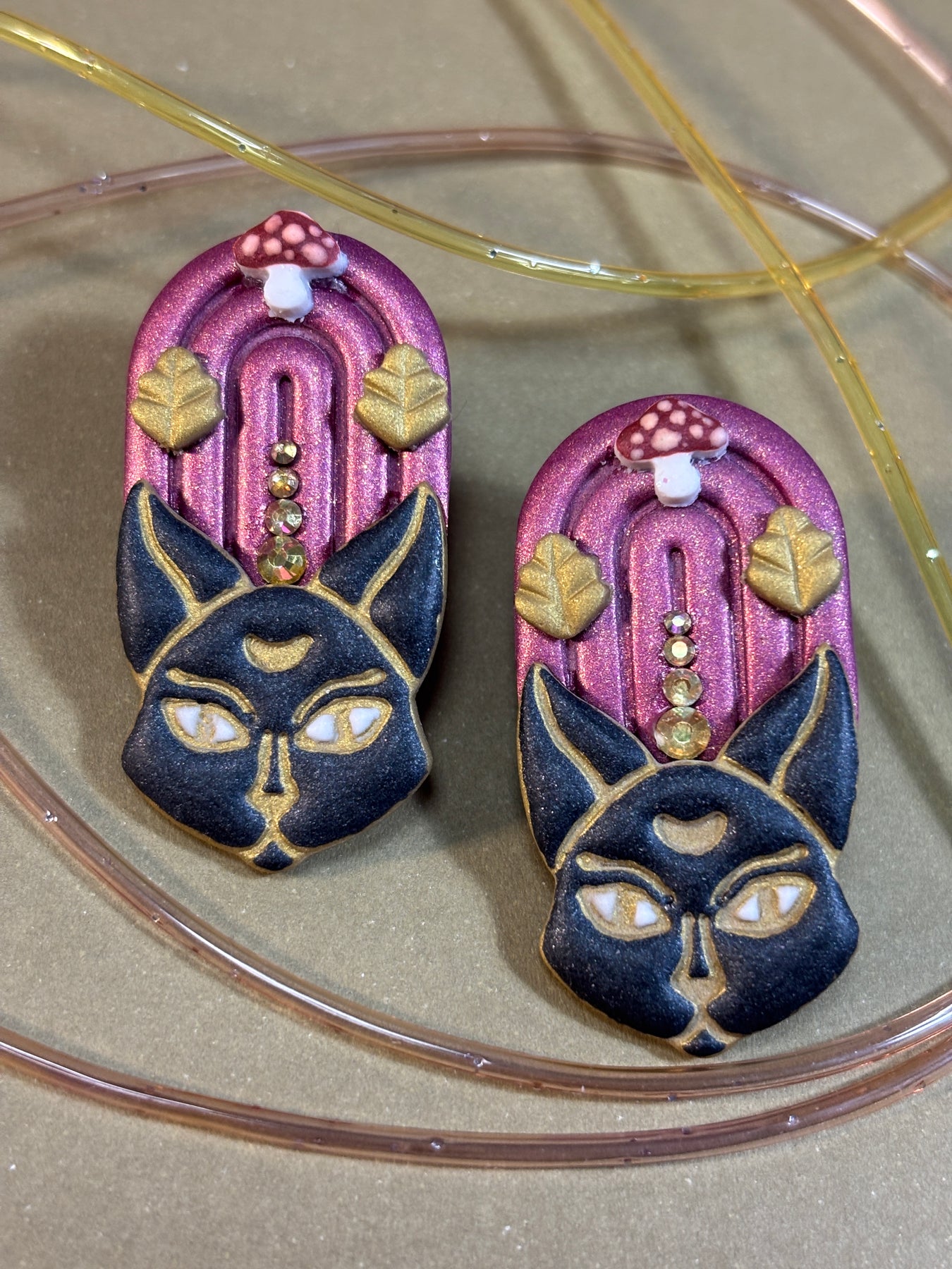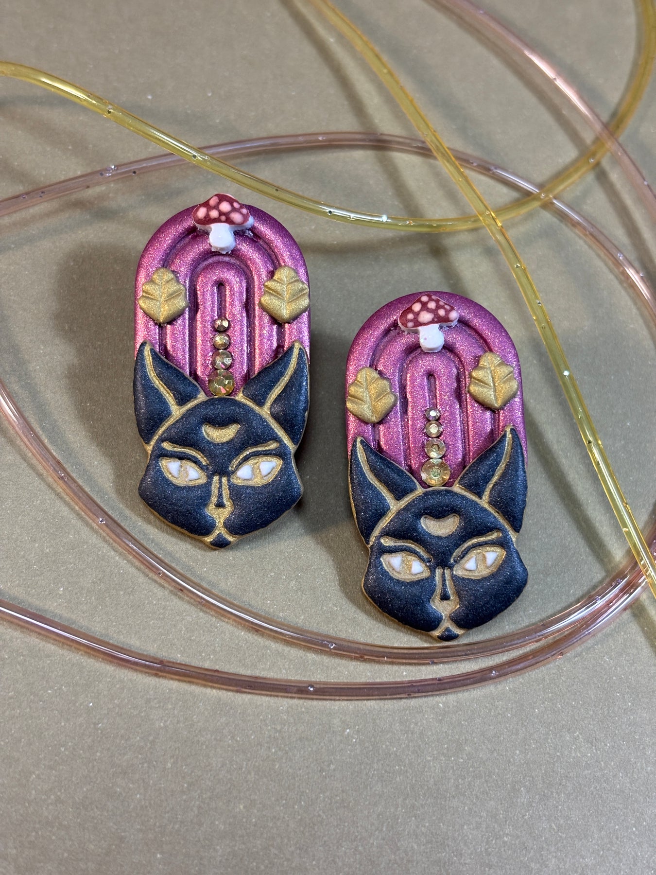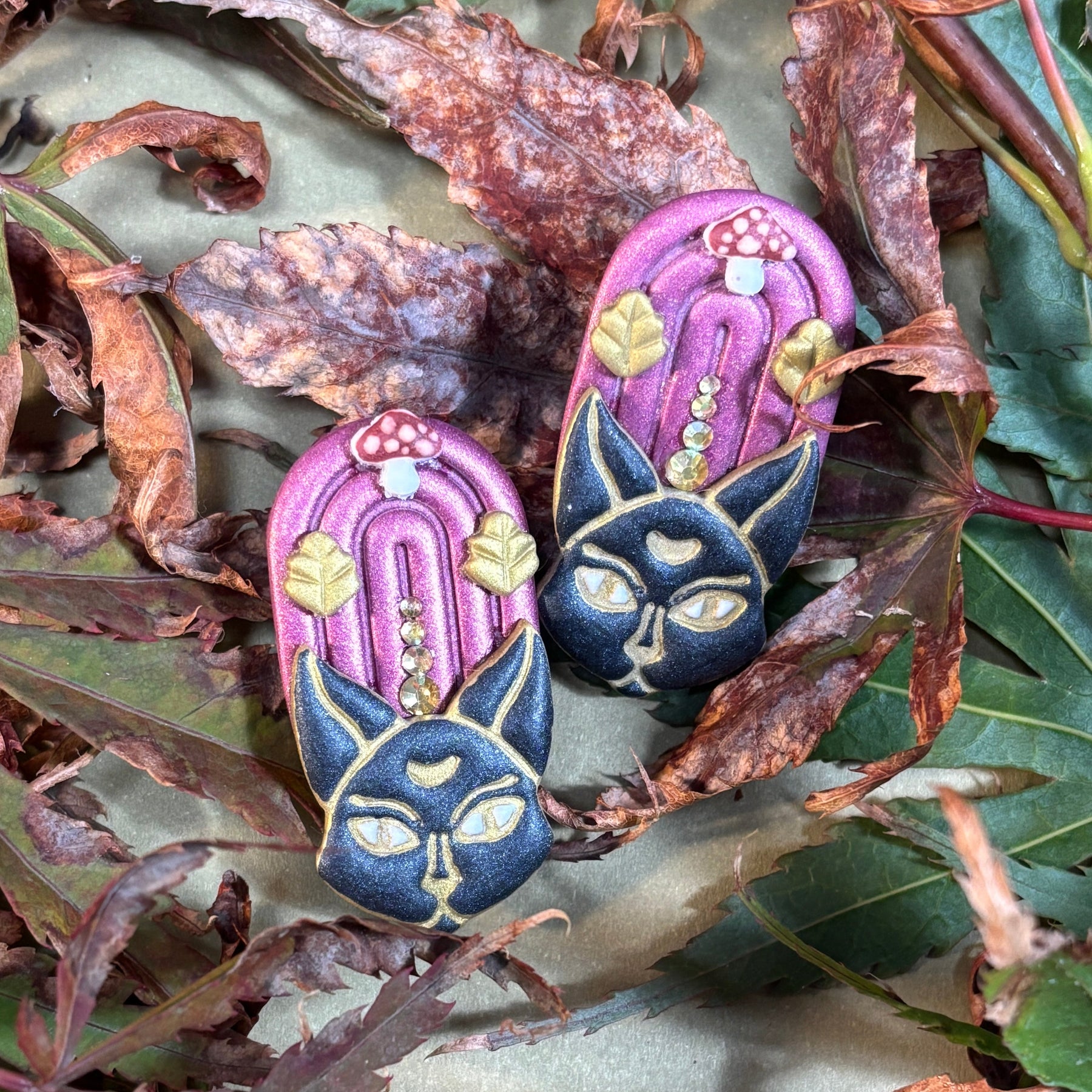 Los Pendientes Gato Místico son el amuleto dark glam de la colección Otoño Mistiko. Hechos a mano en arcilla polimérica, con acabado metálico mate y brillis y detalles inspirados en la magia otoñal.